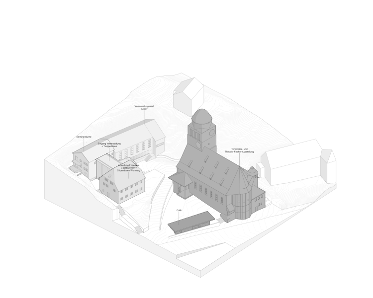Beide Szenarien sollen auf ihre architektonische, räumliche und funktionale Verträglichkeit mit der bestehenden Substanz hin überprüft werden. Das Potential von Gebäudeensemble und Grundstückes soll dabei auch auf mögliche bauliche Ergänzungen hin untersucht werden, um neue funktionale und städtebauliche Möglichkeiten und die veränderte Öffentlichkeit einer Umnutzung zu zeigen. Ziel ist es, eine nicht nur baulich sinnvolle, sondern auch kulturell tragfähige und zukunftsweisende Lösung zu entwickeln, die der Bedeutung des Ortes gerecht wird – als Beispiel für einen respektvollen, kreativen und nachhaltigen Umgang mit baukulturellem Erbe.