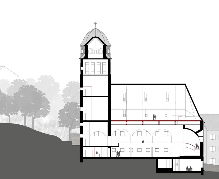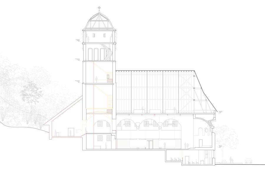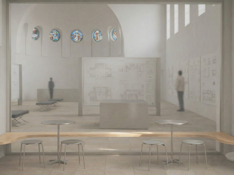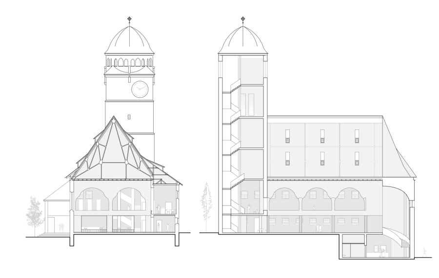 In unserem Studio schlagen wir zwei alternative Nutzungen vor, deren Integration in die Substanz der Erlöserkirche baulich und entwurflich untersucht werden sollen: 1. ein Theodor-Fischer Zentrum als Ort des Archivs, der Forschung, der Ausstellung und der Vermittlung, oder 2. ein neues Zuhause für die Stuttgarter Hymnus Chorknaben, die als musikalisch und gemeinschaftlich geprägte Nachnutzung wohl viel bereits im Bestand angelegtes Potential nutzen könnte.